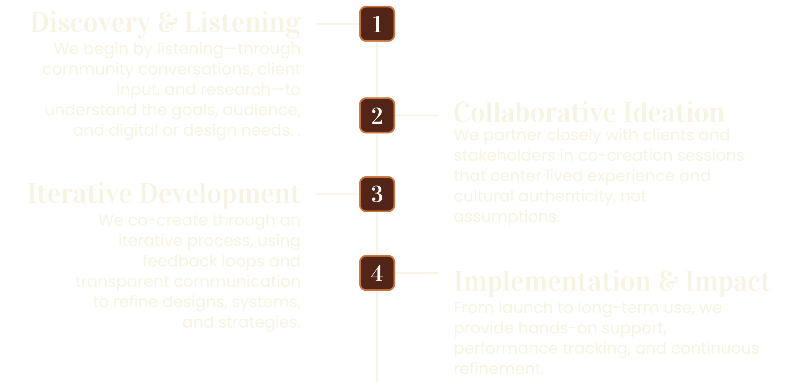 We start by building trust and understanding the deeper purpose behind each project. From there, we move with intention—blending design thinking, systems strategy, and community insight to drive growth and meaningful change.Our philosophy: democratizing design, empowering changemakers and entrepreneurs, and teaching how to build impactful, professional systems on a shrinking budget.