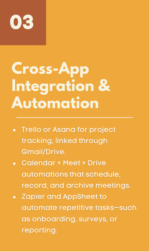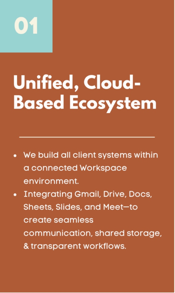 By weaving together our expertise with Google Workspace , OWL creates adaptive digital ecosystems, supporting clients with: