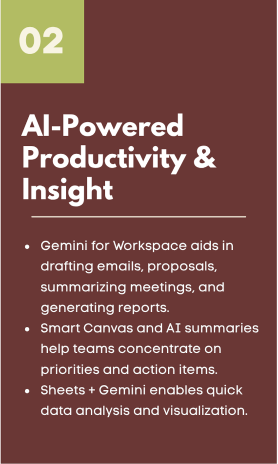 Odenkyem-Wade Limited (OWL), LLC, uses Google Workspace applications like Gmail, Drive, Docs, Sheets, Meet, & Calendar, to design collaborative environments where communication, project management, and data sharing flow seamlessly. By integrating Google Workspace’s AI capabilities, including Gemini, NotebookLM, and Google AI Studio, we help clients automate routine work, organize knowledge, and generate actionable insights in real time.