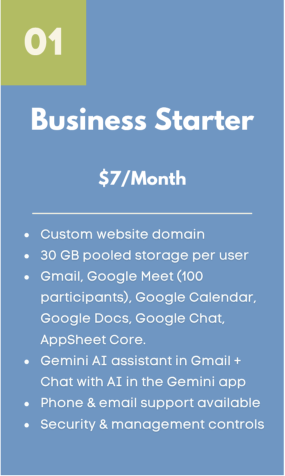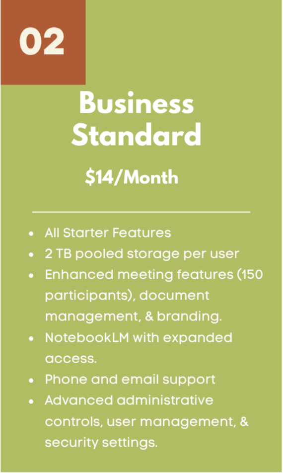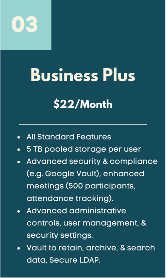 Google Workspace offers several pricing plans tailored to different types of users and organizational needs. Most business level workspace plans are suitable for small to medium-sized businesses with 1-500 users.