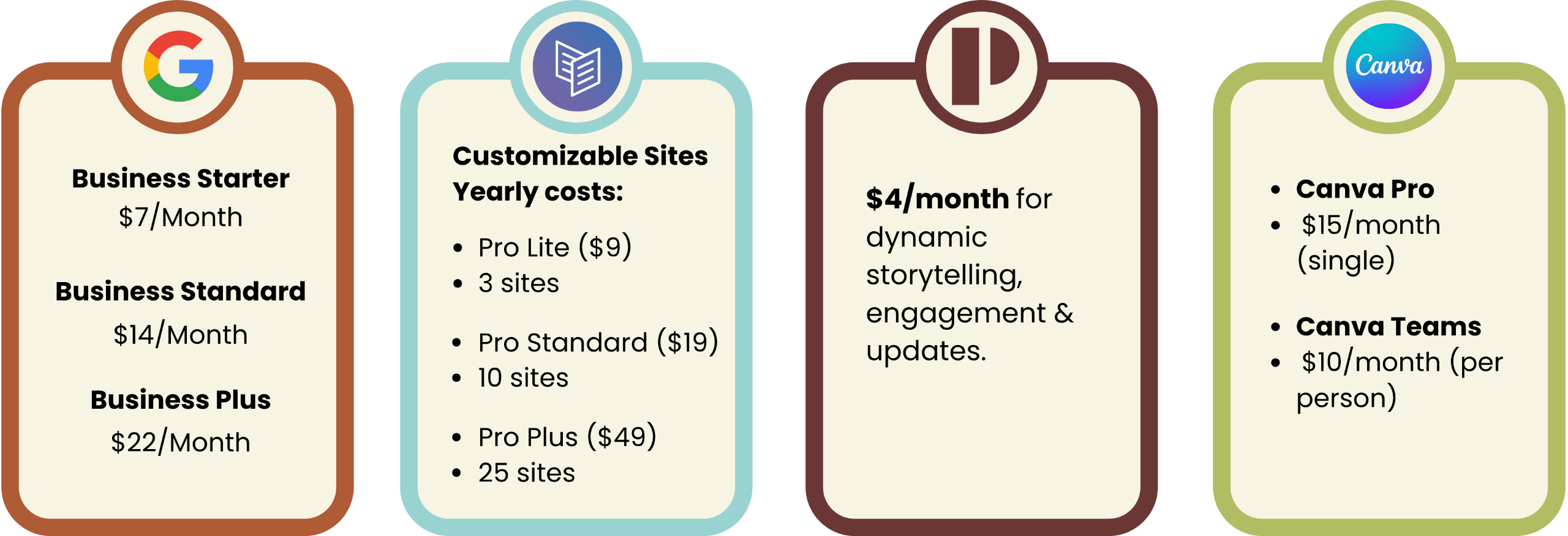 Our work & skills position cost effective design and digital tools like Canva, Carrd, Postcard.page, & Google Workspace (with its built in AI tools), as accessible bridges to professional storytelling, brand coherence, and operational efficiency.