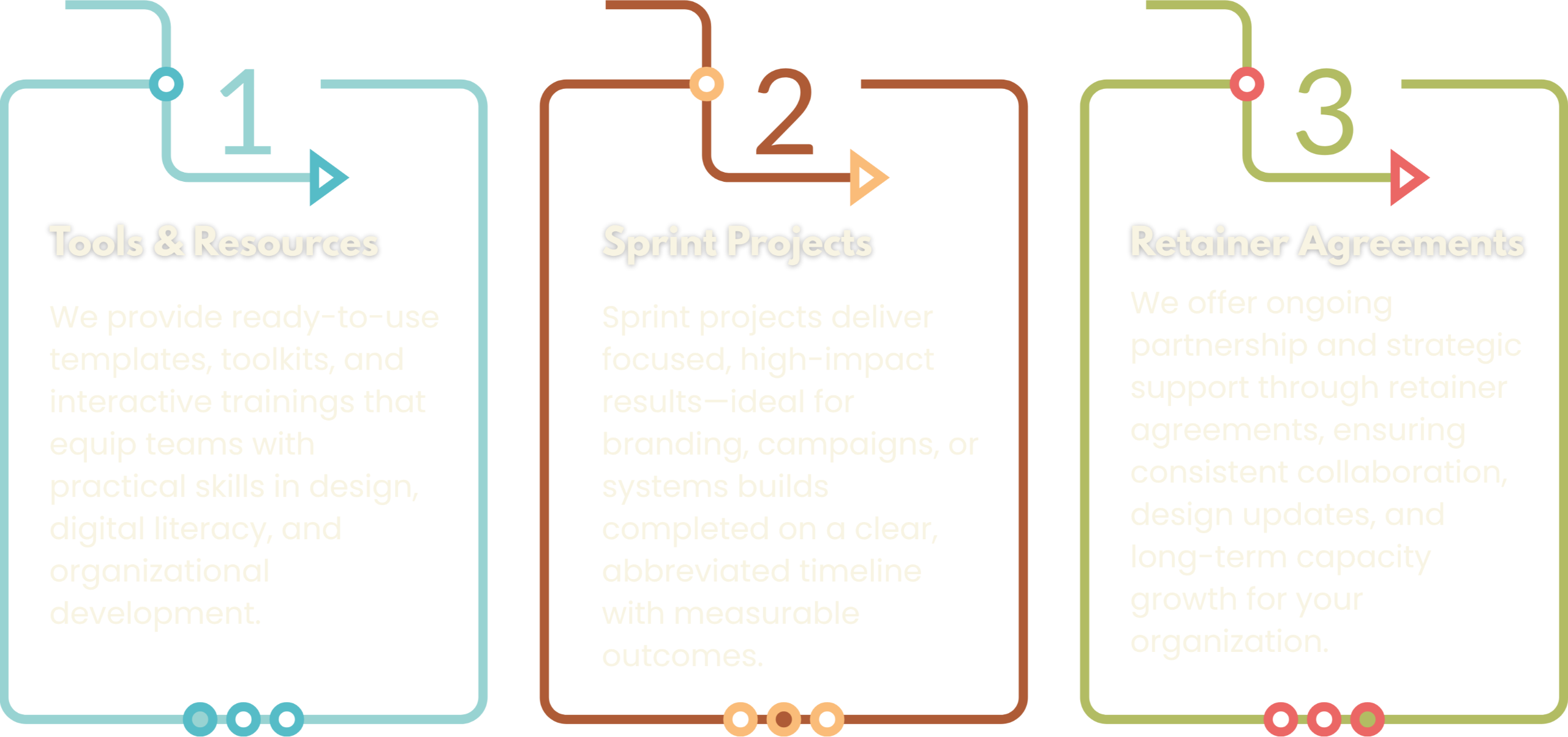 OWL offers flexible support at every stage of growth—Products & Trainings build skills, Sprint Projects deliver quick, high-impact solutions, and Retainer Agreements provide ongoing creative and strategic partnership for lasting impact.Our approach is inherently collaborative, culturally responsive, and strategically crafted to serve organizations and individuals driving social change, with limited resources and capacity.We offer support in one or a combination of three (3) ways: